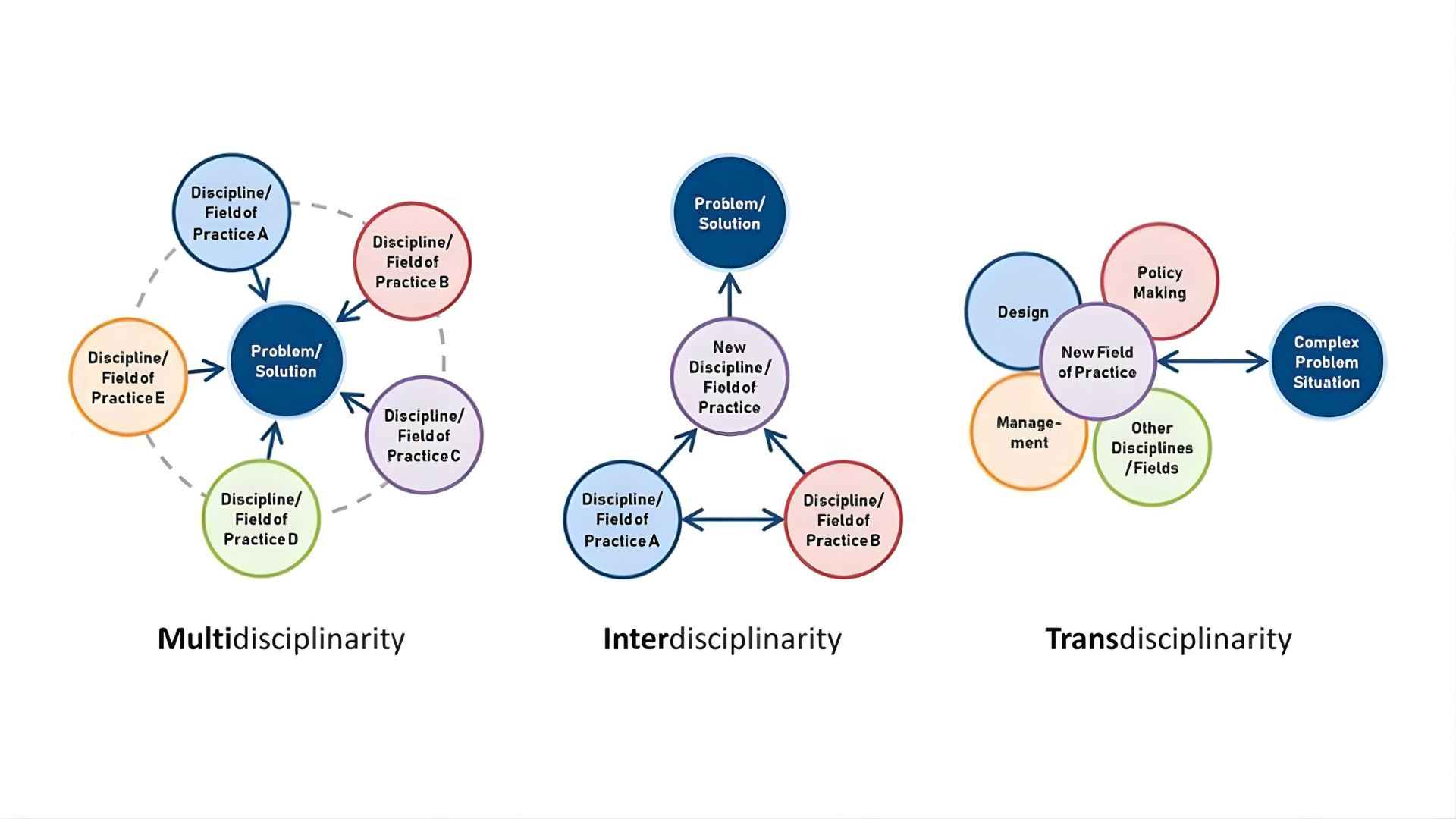 The mixing of disciplines and transcending them to include applied practices and end-user co-design is visualised below and showcases the beneficial difference of TD Research and its ability to create and foster innovation, from more common, multidisciplinary and interdisciplinary research approaches.