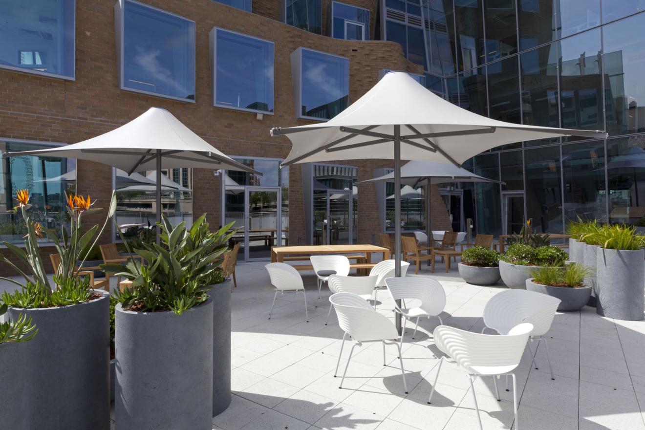 It also offers access to an outdoor terrace with umbrellas, large pot plants, and seating.