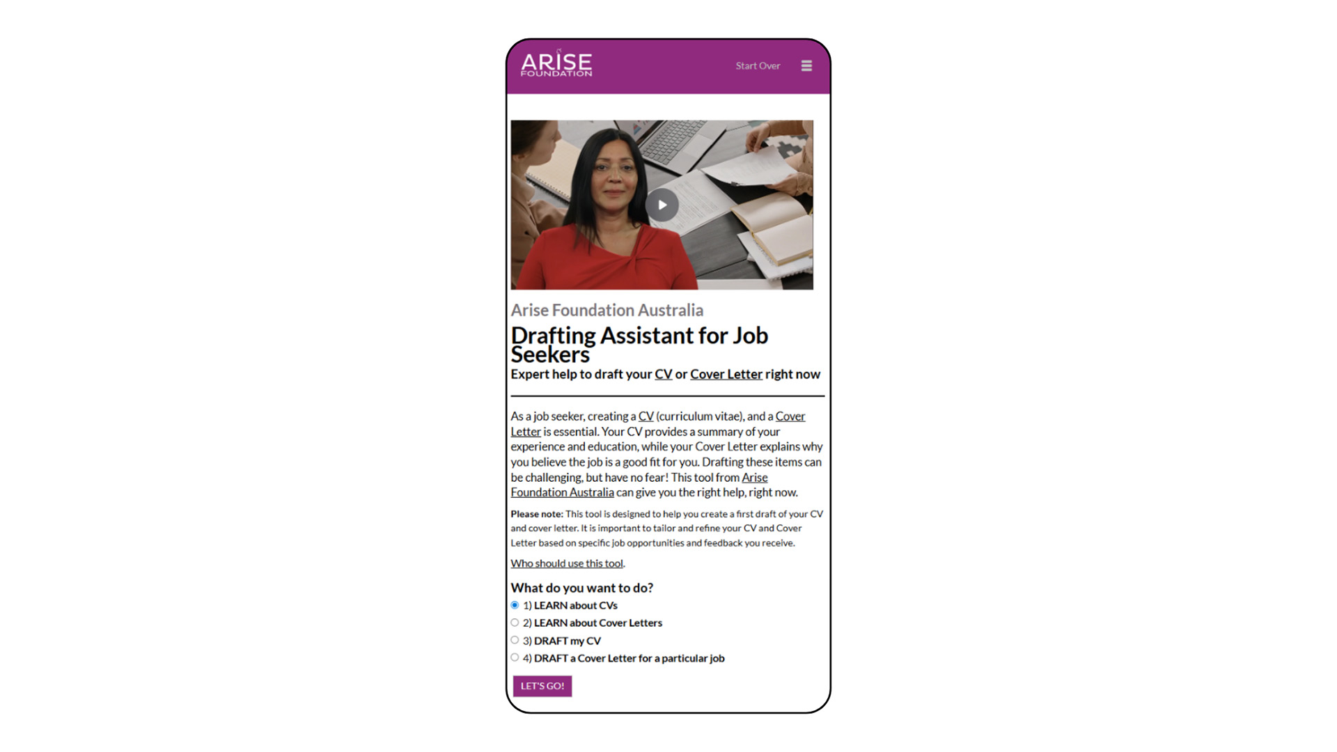 Image: The landing page image of the app UTS students developed for Arise Foundation. This app assists survivors of financial abuse in re-entering the workforce by providing expert help in drafting CVs and cover letters.