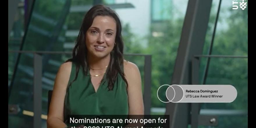 Nominations are now open for the 2023 UTS Alumni Awards. Rebecca Dominguez, UTS Alumni and proud recipient of the 2022 Law Award, encourages the alumni community to nominate candidates for this year's Awards.