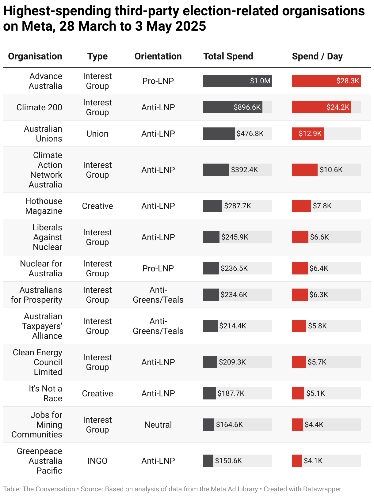 Conservative campaign group Advance Australia spent just less than $50,000 on Meta on the final day of the campaign (social media advertising is exempt from the two-day ad-blackout laws affecting traditional media operators).