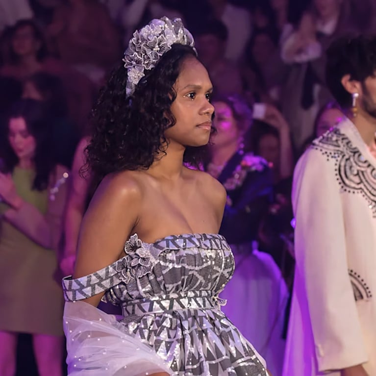 Alongside this reimagined piece, the exhibition showcases McCann’s signature Indigenous glamour in his existing gowns. These contemporary debutante dresses retain the colonial, white tradition yet are culturally updated with Indigenous designs.