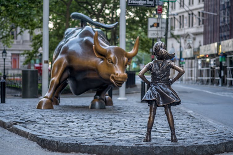 ‘Charging Bull’ and ‘Fearless Girl’ sculptures outside the New York Stock Exchange. Shutterstock